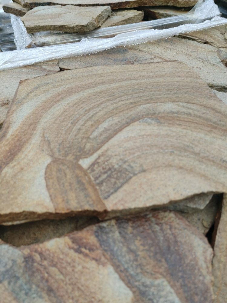 Песчаник жёлтый с разводами - для работ по облицовке стен, фундаментов, заборов.